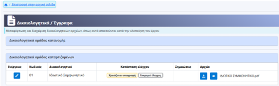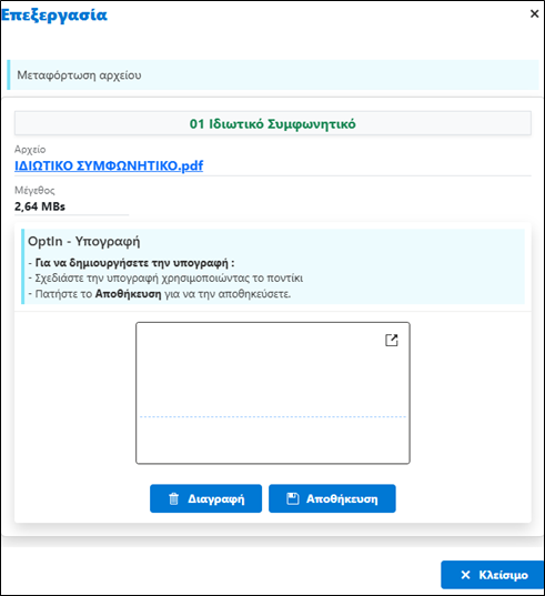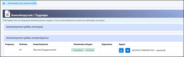 Όταν επιλέξετε «Κλείσιμο» επιστέφει στο κεντρικό μενού των «Δικαιολογητικών/Έγγραφα», όπου εμφανίζεται η ένδειξη ότι το συμφωνητικό έχει υπογραφεί.