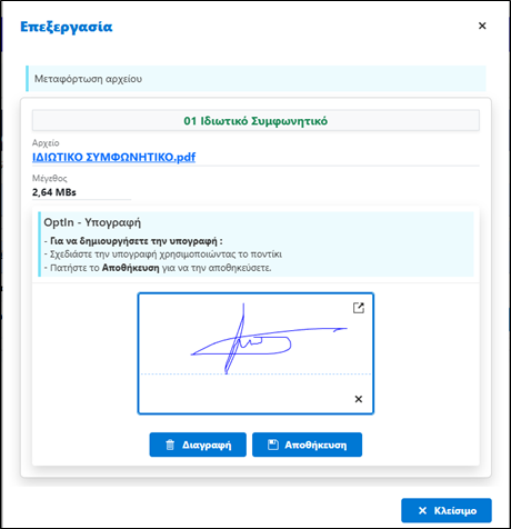 Επιλέγοντας το συγκεκριμένο κουμπί μπορείτε να υπογράψετε το συμφωνητικό.