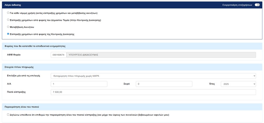 Στο «Ποσό είσπραξης», θα πρέπει να εισαχθεί το σύνολο του ποσού που έχει να λάβει το Κέντρο για το συγκεκριμένο τμήμα που υποβάλλει αίτηση. Για παράδειγμα, αν έχουν ολοκληρώσει 25 ωφελούμενοι την επιμόρφωση, το ποσό θα ανέρχεται σε 25Χ300€ = 7.500€, ενώ αν έχουν ολοκληρώσει την επιμόρφωση 20 ωφελούμενοι το ποσό θα ανέρχεται 20Χ300€ = 6.000€.
